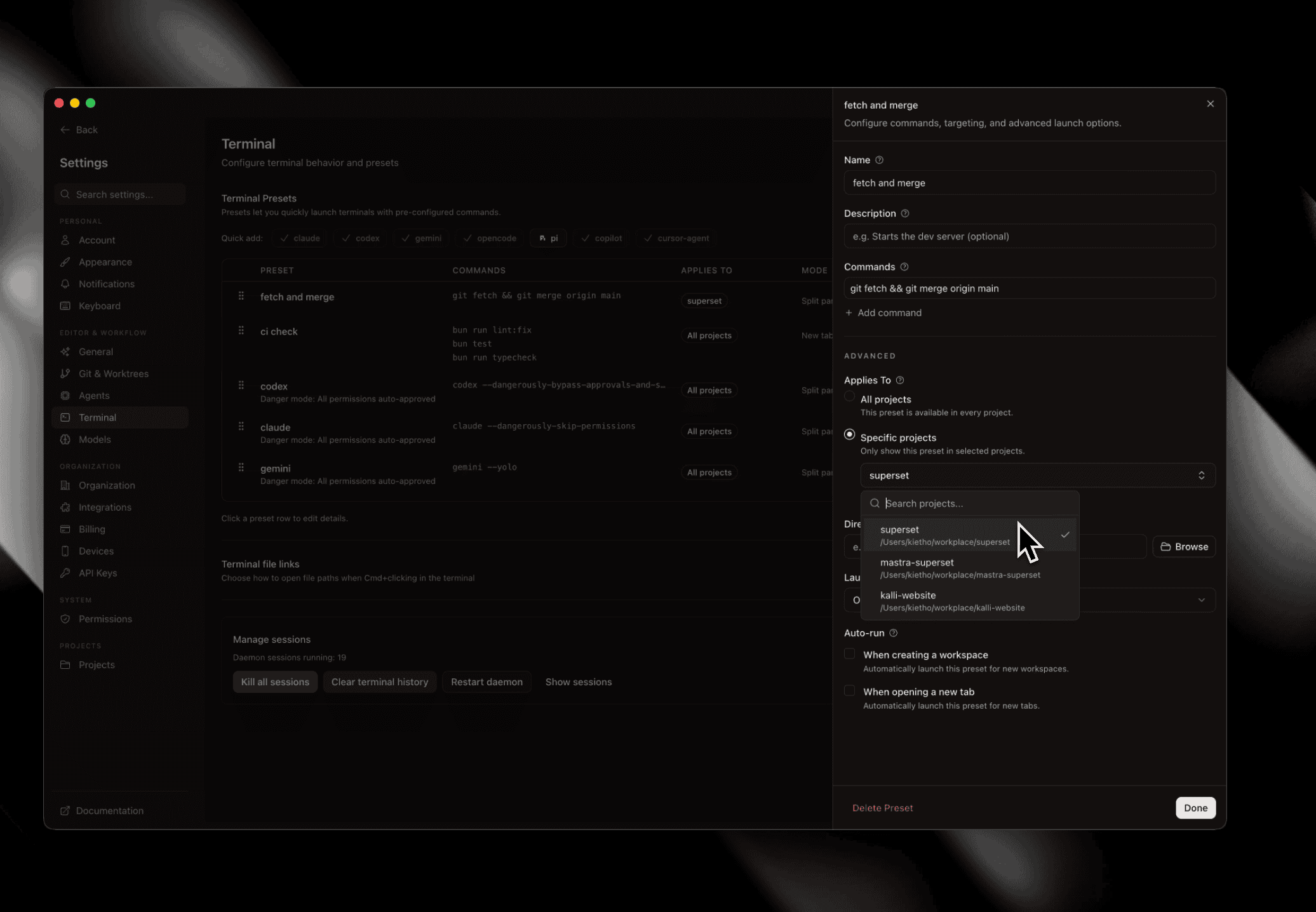 Terminal presets can now be scoped to a specific project. Project-level presets only appear when you're working in that project, keeping the preset list clean and context-relevant.