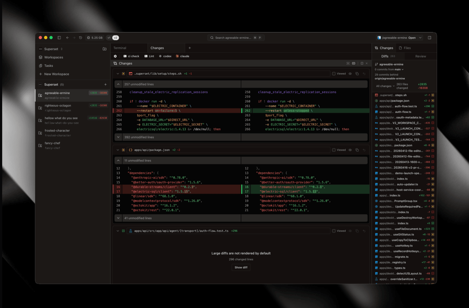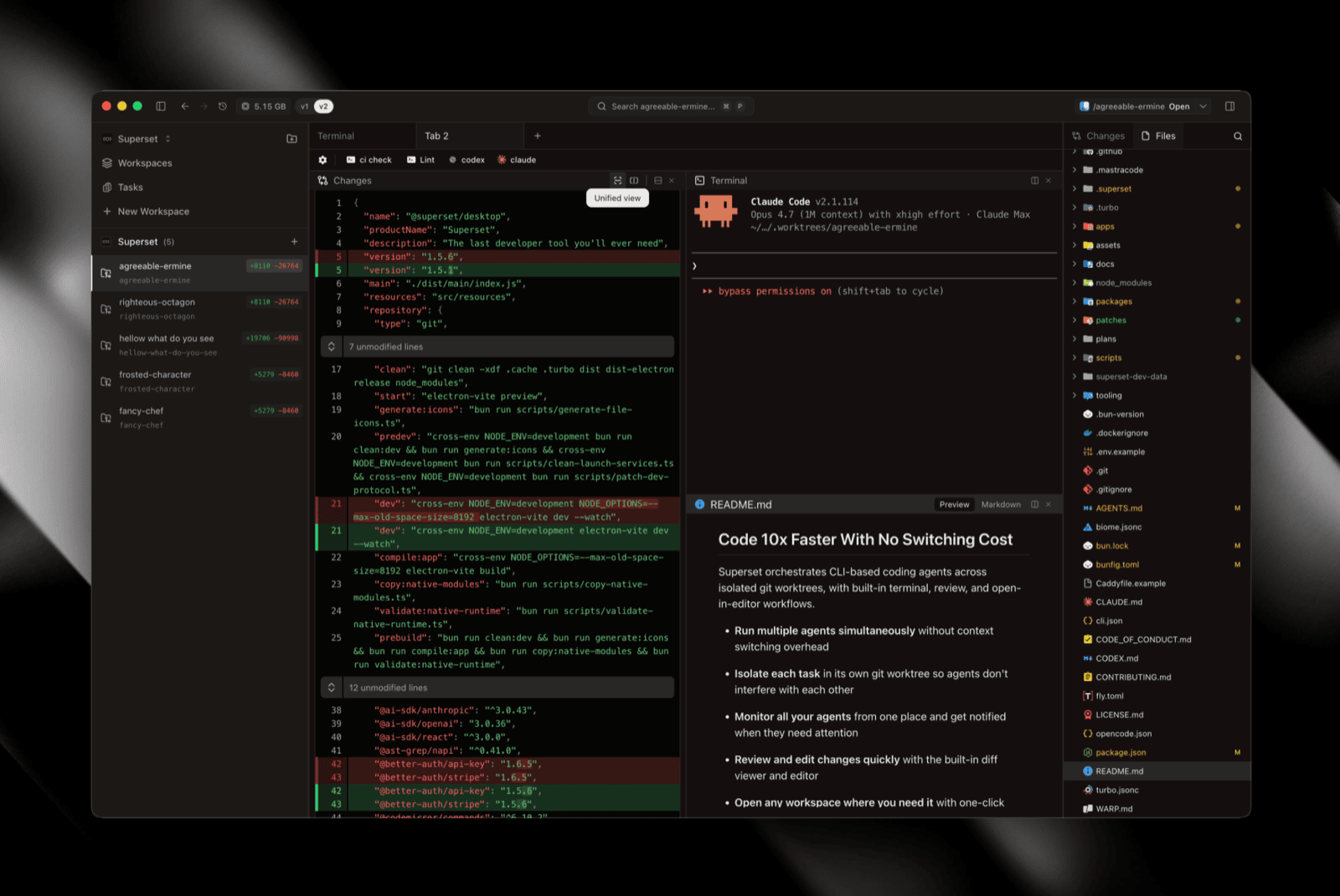 v2 is a ground-up rebuild of the workspace aimed at cloud. We tore out v1's accumulated cruft, rewrote the terminal from scratch to fix the rendering glitches, and re-architected the app like a real IDE — Tab → Split → Pane, a proper file tree with git decorations, a full editor, and a diff viewer that handles large changesets. Opt-in for now; here's what's in the box: